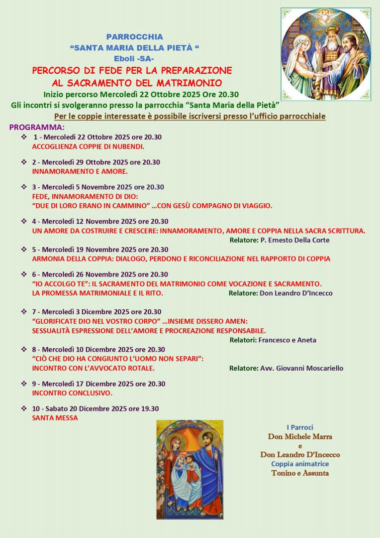 Mercoledì 22 ottobre 2025: Inizio Percorso di Fede in preprazione al Sacramenro del Matrimonio Parr. S. Maria della Pietà - Eboli
